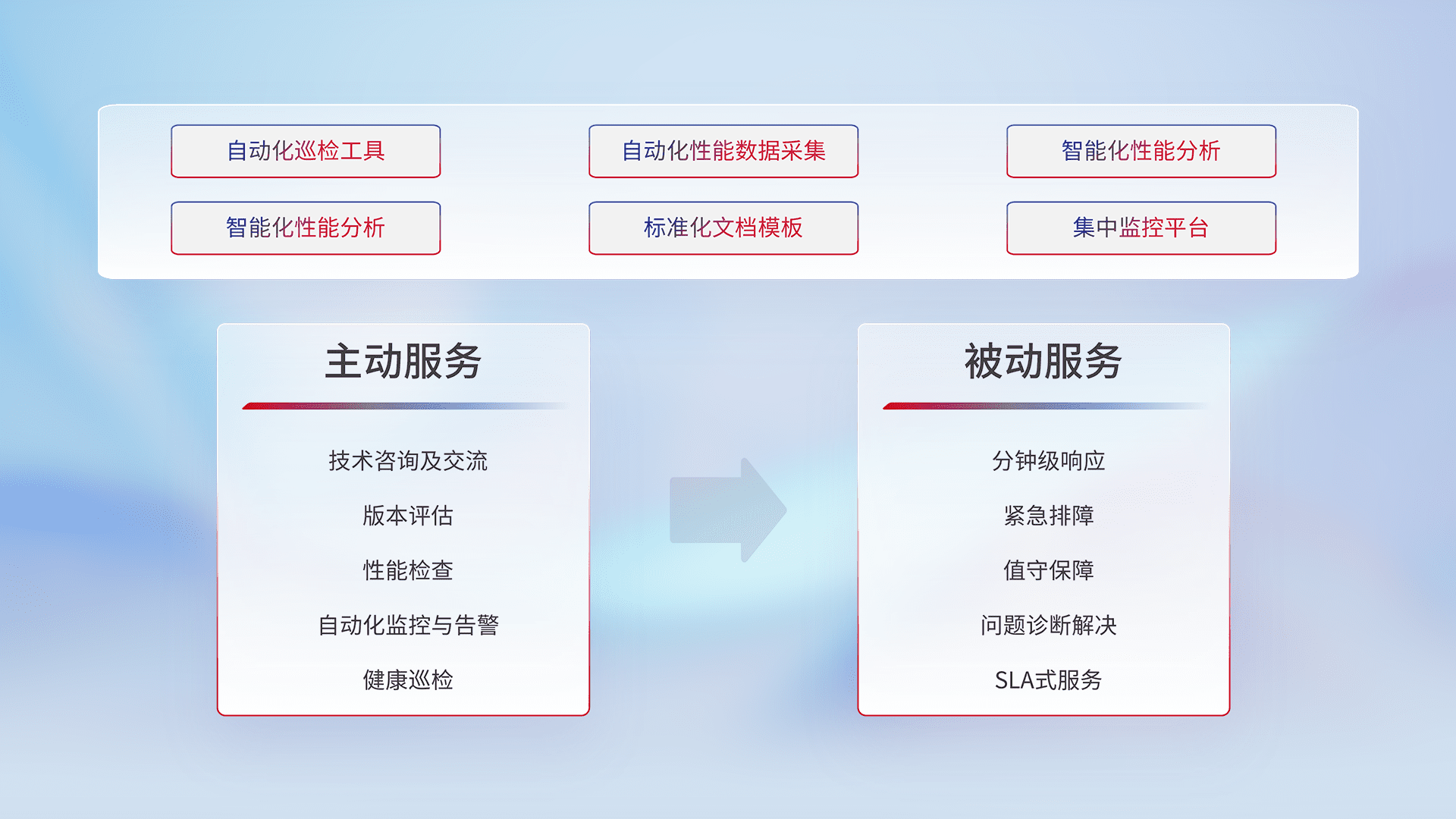 智能化工具和标准化文档,,,保障服务质量,,提供主动服务(包含技术咨询、、、、版本评估、、、、性能检查、、、、自动化监控与告警、、健康巡检)和被动服务包含(分钟级响应、、、、紧急排障、、、值守保障、、问题诊断解决、、SLA服务)。。。